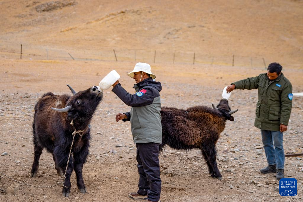 4月8日,羌塘国家级自然保护区那曲地区管理局野生动物专业管护员罗布(左)和同事在给收养的小野牦牛喂奶。
