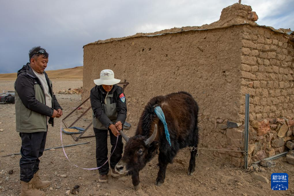 4月8日,羌塘国家级自然保护区那曲地区管理局野生动物专业管护员格桑伦珠(左)和罗布在尼玛县玛依野生动物管护站测量收养的小野牦牛“尕尕”的身体数据。