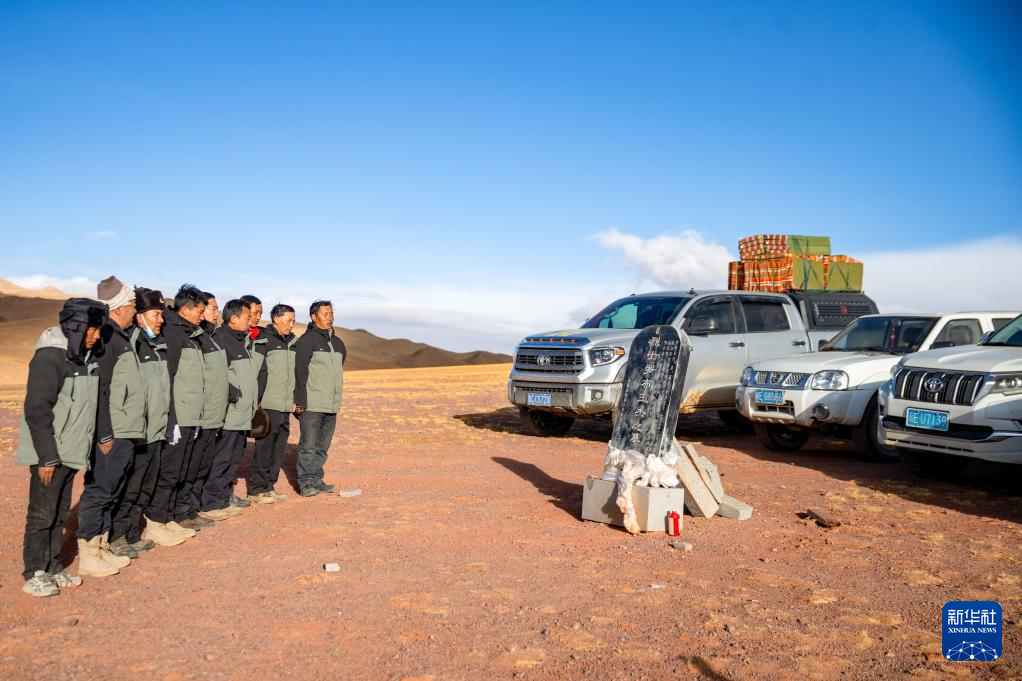 4月8日,即将进入“无人区”进行巡护的羌塘国家级自然保护区那曲地区管理局野生动物专业管护员们按惯例在罗布玉杰烈士墓前默哀致敬。罗布玉杰2002年在与盗猎分子的枪战中牺牲。