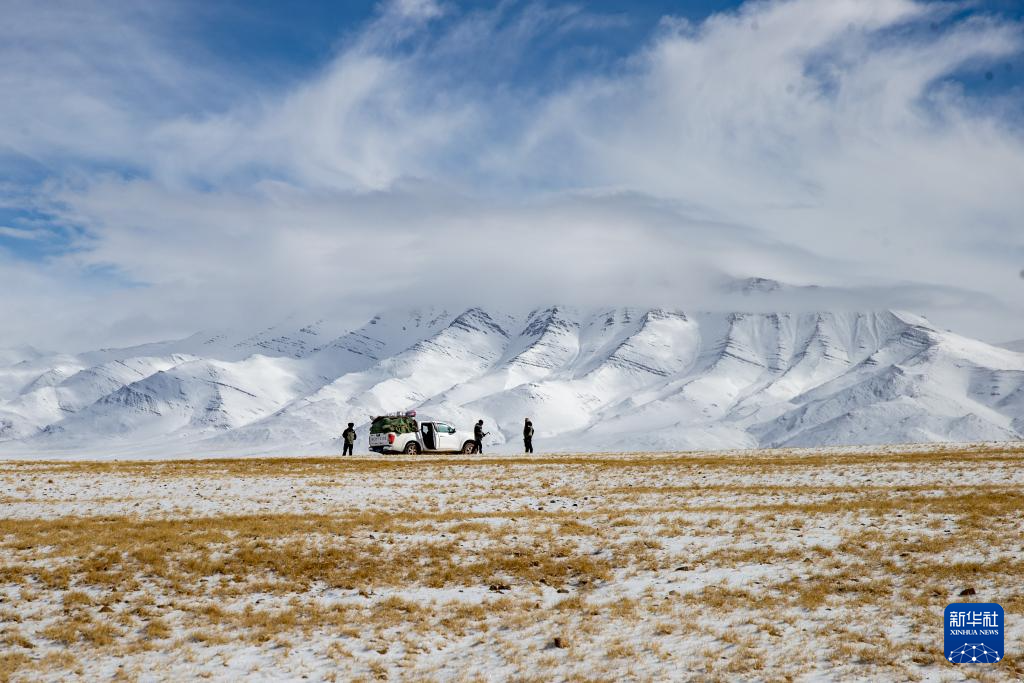 4月9日,羌塘国家级自然保护区那曲地区管理局野生动物专业管护员们在雪山前观察地势。