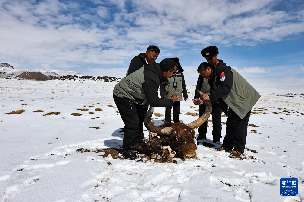 4月10日,羌塘国家级自然保护区那曲地区管理局野生动物专业管护员们在“巴毛穷宗”地区测量一头异常庞大的野牦牛遗骸。
