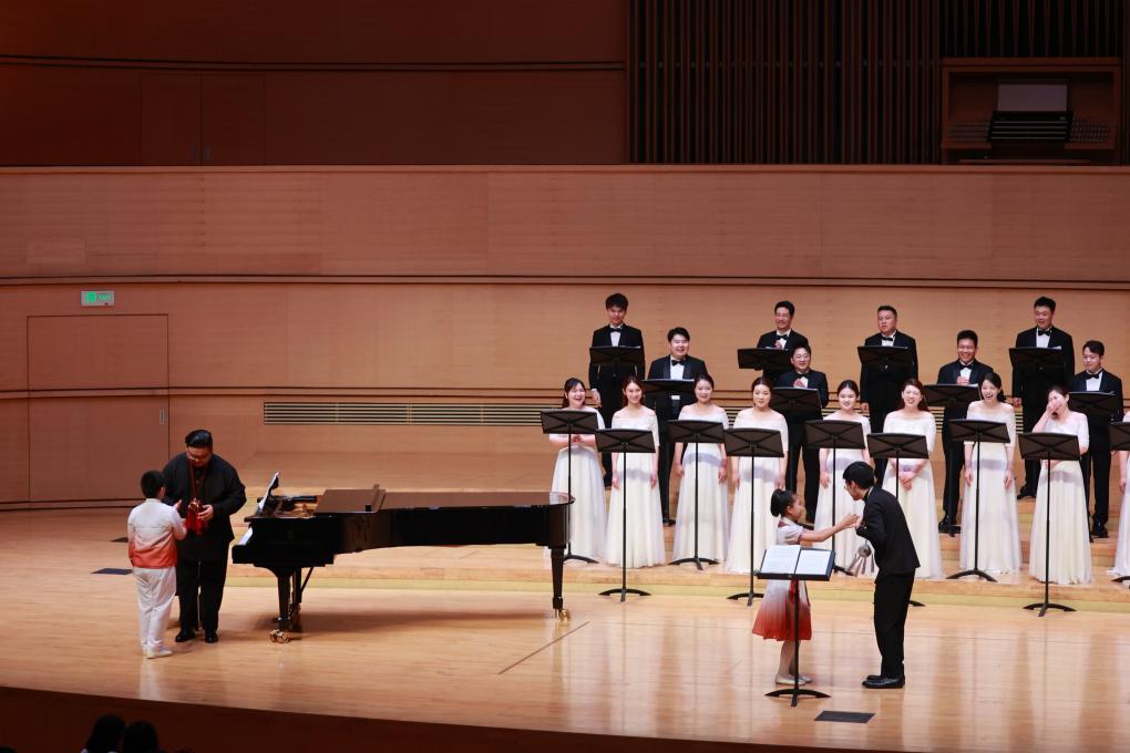 在广西文化艺术中心的一场“三月三”主题演出中,小演员向合唱团成员送上绣球。新华社记者黄凯莹 摄