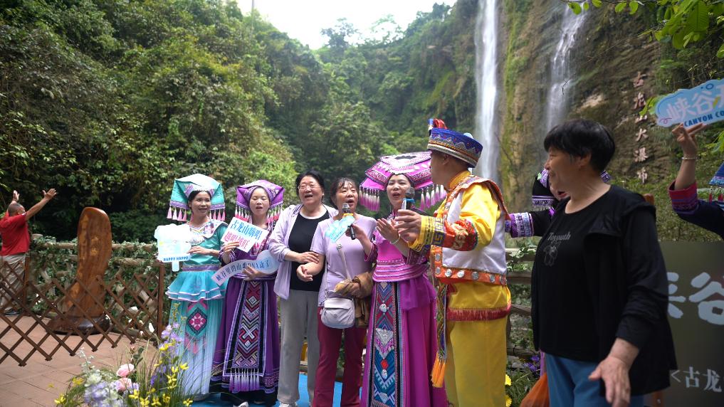 在古龙山大峡谷景区里,游客与身着民族节日盛装的工作人员一同唱山歌。(受访者供图)