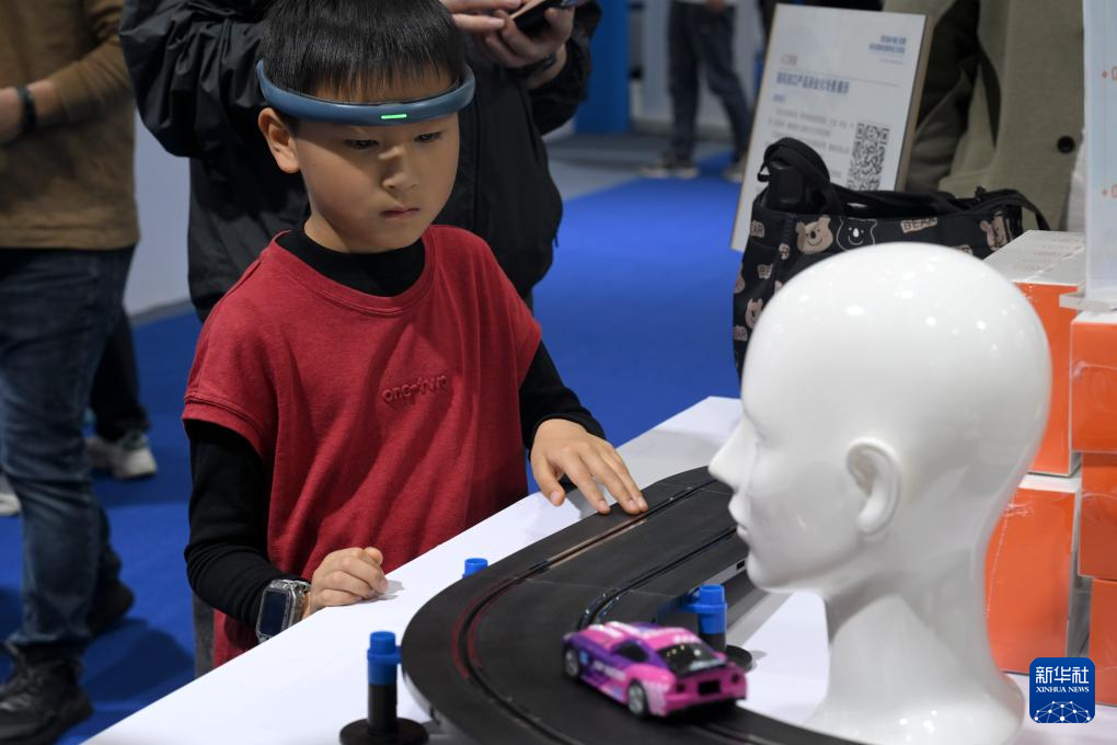 4月26日,小朋友在第四届中国(安徽)科技创新成果转化交易会上体验一款脑控赛车。