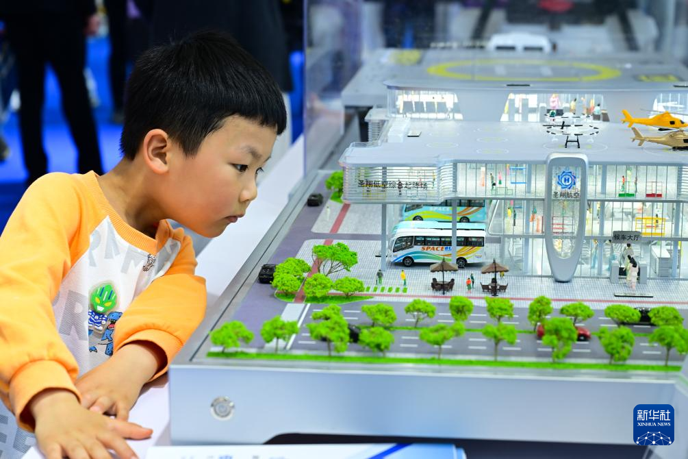 4月26日,小朋友在第四届中国(安徽)科技创新成果转化交易会上观看一款低空枢纽起降场模型。