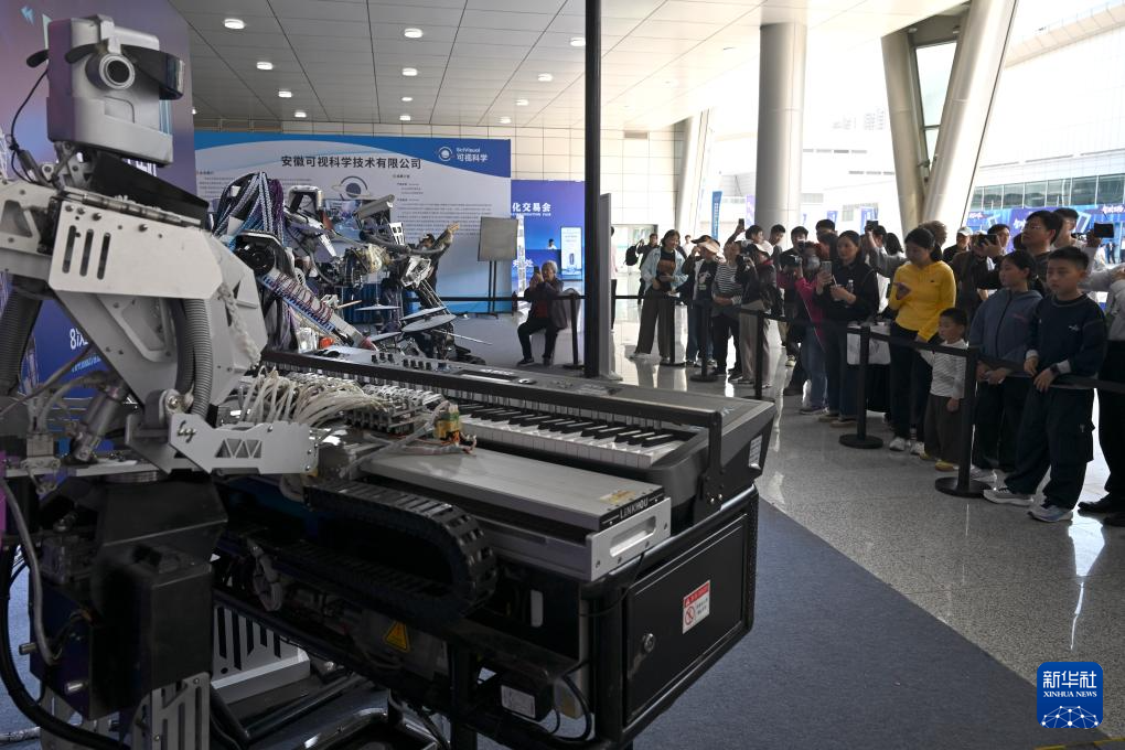 4月26日,观众在第四届中国(安徽)科技创新成果转化交易会上观看机器人乐队演出。
