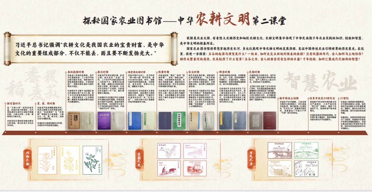 国家农业图书馆围绕文化传承与农业强国建设需求,积极贯彻落实习近平总书记关于“赓续农耕文明”指示精神,创新优秀传统农耕文化时代表达,通过元素、形态、文化的解构与重组,把优秀传统农耕文化中的核心理念转化为具象表达的科普作品与超级课堂。