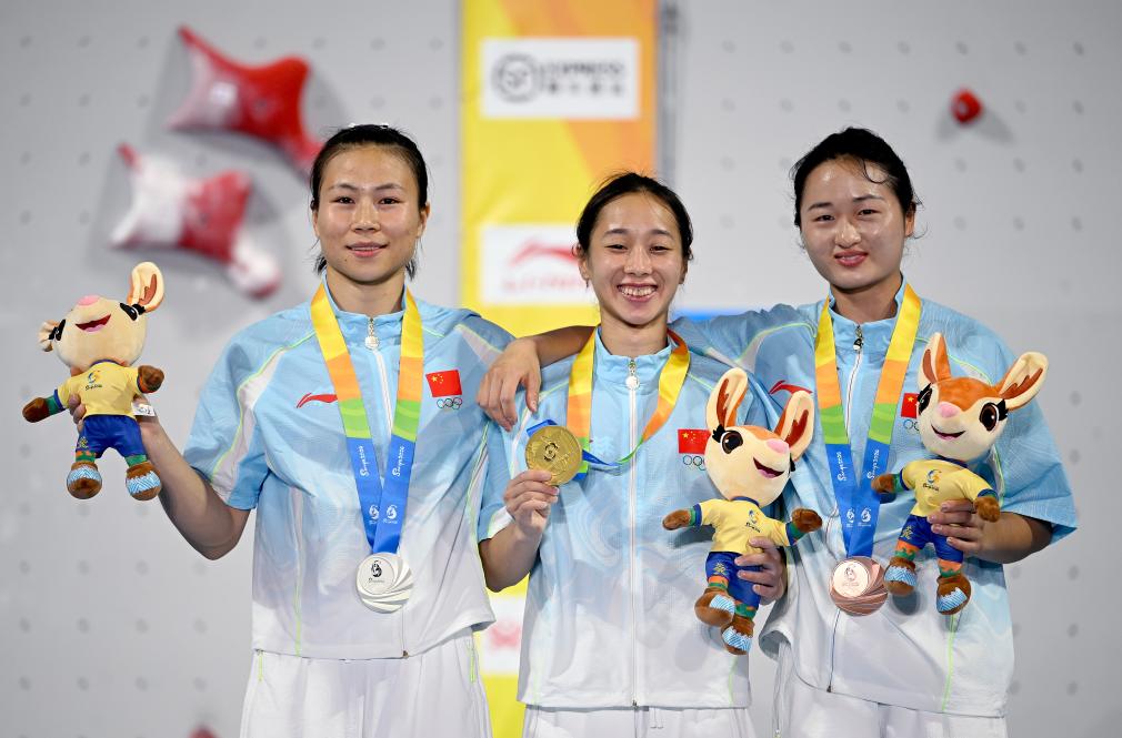 4月28日,冠军中国选手周娅菲(中)、亚军中国选手邓丽娟(左)和季军中国选手张少琴在颁奖仪式上。新华社记者 赵子硕 摄