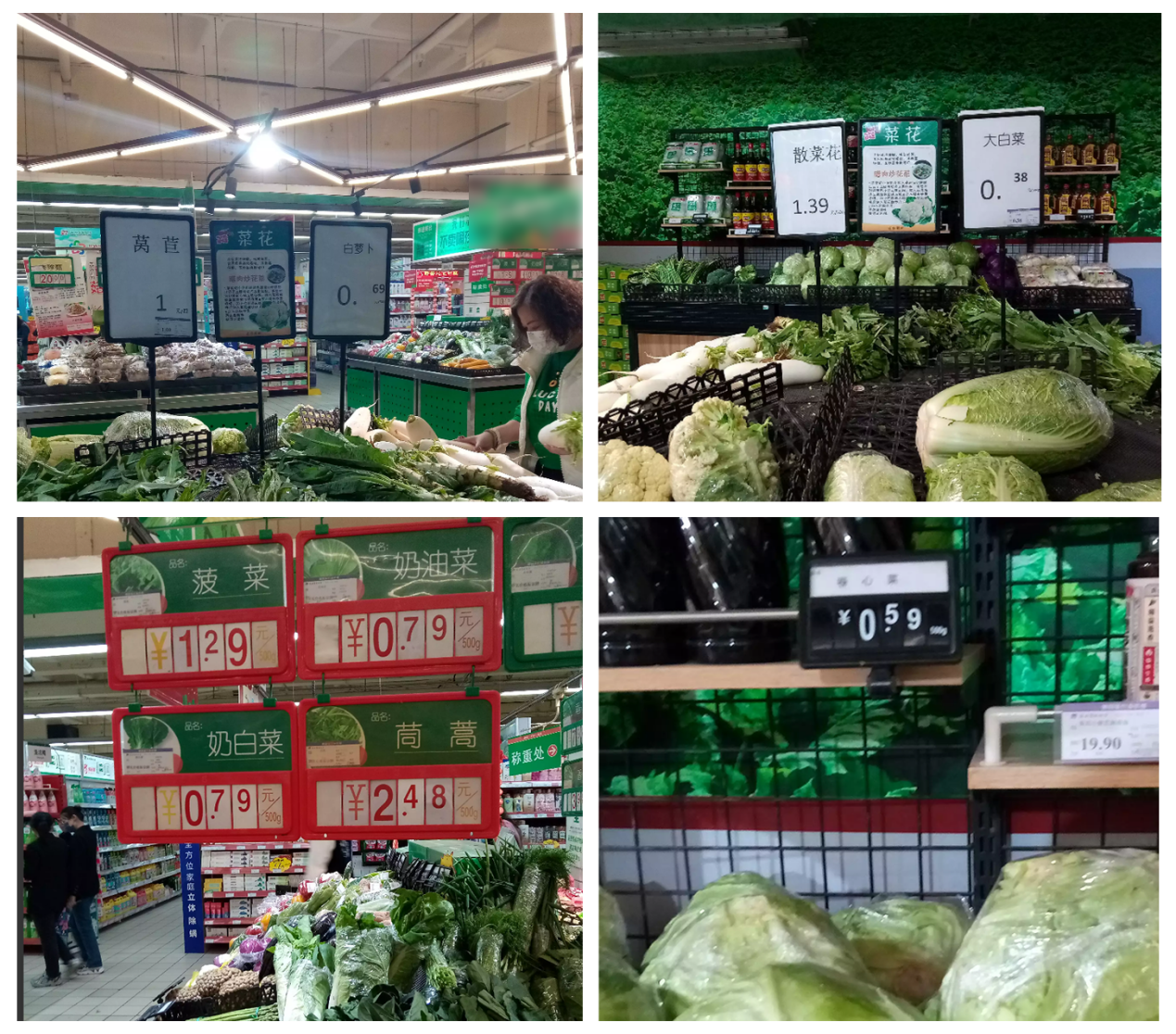 “大白菜0.38元/斤“,“卷心菜0.59元/斤”,“白萝卜0.69元”,“奶白菜,奶油菜每斤都是0.79元,莴苣每斤1元”。网友惊呼一元菜重出江湖!