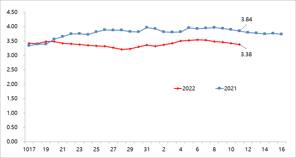 北京最大的农产品批发市场—新发地的数据显示,11月11日当日的蔬菜加权平均价是3.38元/公斤,比11月4日的3.50元/公斤下降3.43%;