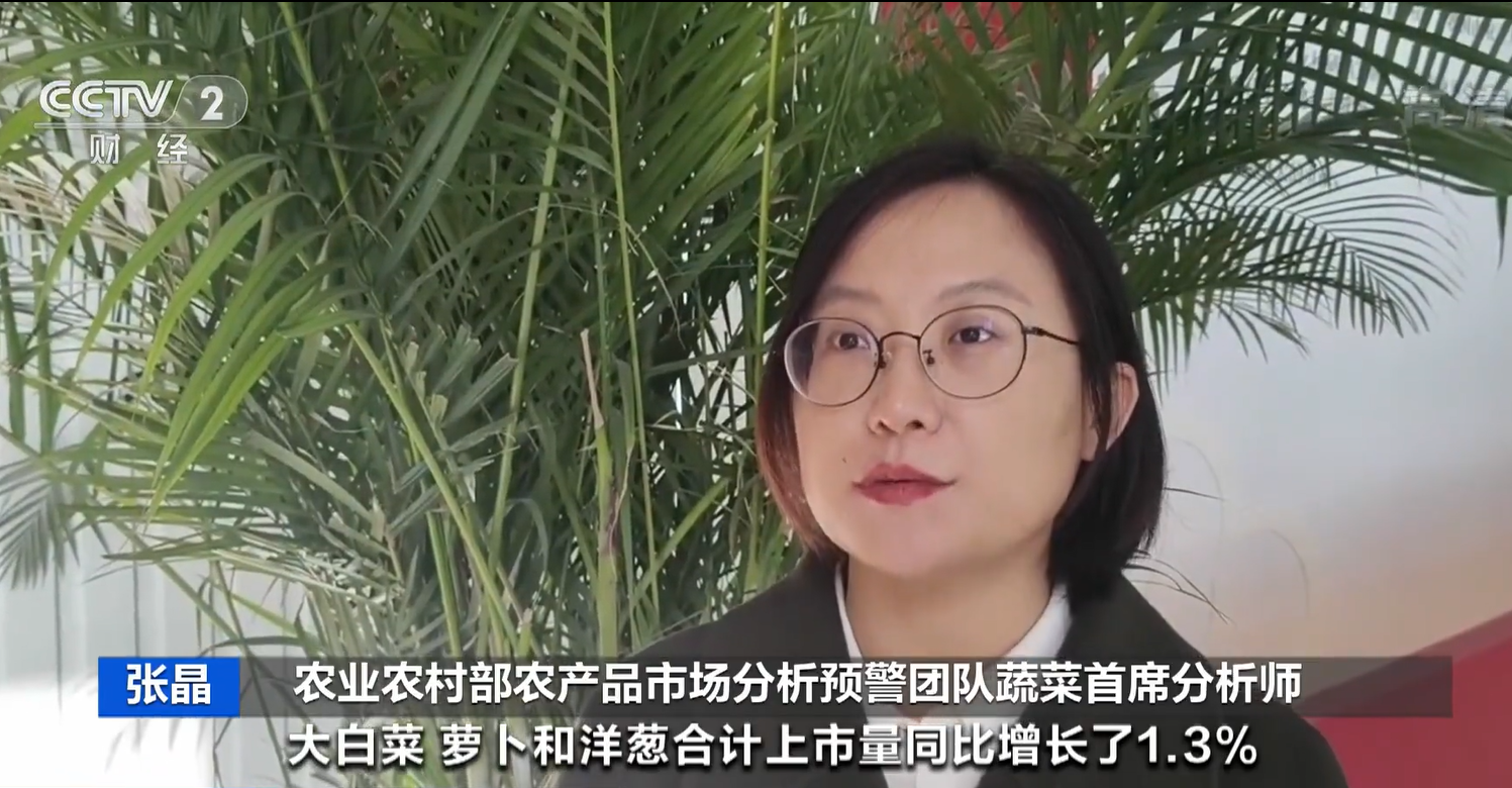农业农村部农产品市场分析预警团队蔬菜首席分析师 张晶:从全国批发市场上市量来看,10月11月累计冬季大宗蔬菜,大白菜、萝卜和洋葱合计上市量同比增长了1.3%,其中白萝卜同比增长15%,供应量十分充足。