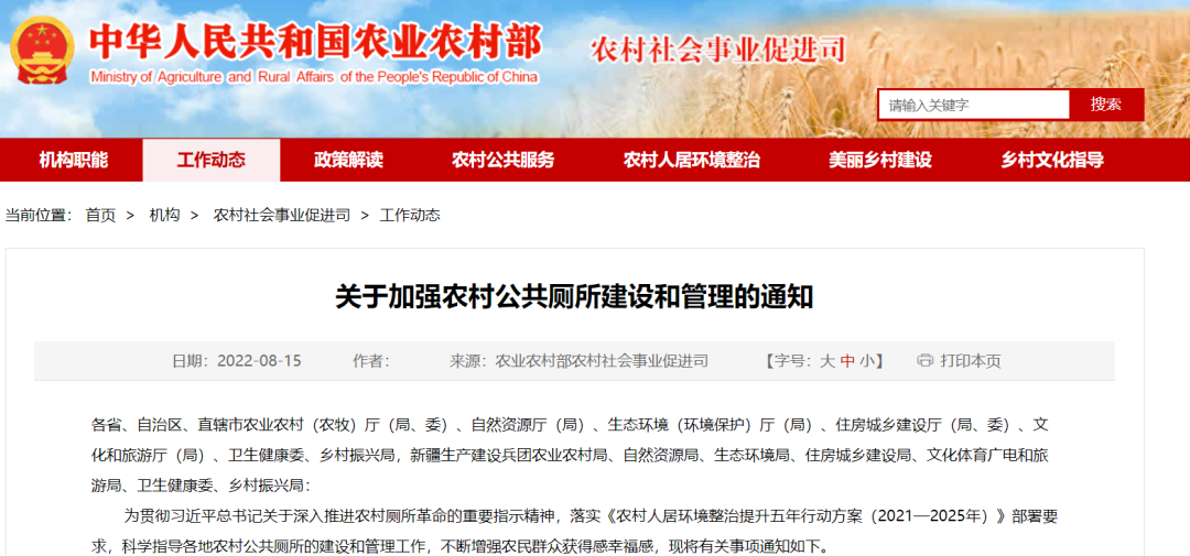 近日,农业农村部办公厅、自然资源部办公厅等多部门印发《关于加强农村公共厕所建设和管理的通知》。