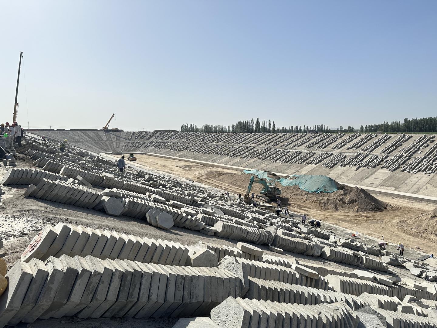 在西营3干2号调蓄水池工程建设现场,近百名施工作业人员以及多台机械设备正在紧密施工,据负责人介绍,该工程现已完成供水管网和引水渠的建设,蓄水池主体工程正在进行最后一道工序坡面混凝土预制块的铺设,该工程完工后主要为五和镇和永昌镇的部分村提供灌溉以及生态用水,预计在七月中旬达到蓄水条件,可蓄水42万立方米。