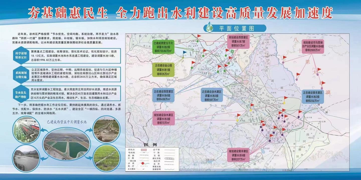 近年来,为全面贯彻“节水优先、空间均衡、系统治理、两手发力”治水思路,凉州区紧紧牵住水资源高效利用这个“牛鼻子”,优化水资源调度,着力破解资源性缺水和时空来水分布不均等难题,谋划实施凉州区调蓄工程,建设调蓄水池13座,总容积1998.82万立方米。项目建成后,将形成以河流水系为脉络、调蓄水池为骨干、受益村庄和企业为节点的“四河十三池”水系连通网,打造新时期水资源优化调配的“凉州样板”。